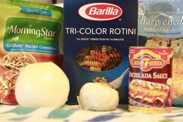 Necesitarás un diente de ajo, la mitad de una cebolla, una lata de salsa de enchilada (15 onzas), carne de hamburguesa falso (media bolsa de MorningStar se desmorona), pasta rotini y una taza de queso (yo escogí reduce fat cheddar agudo). También necesitarás algunos vegetales de aceite y 4 tazas de agua (ambos en la foto no).