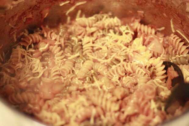 Cuando mucho del agua ha sido hervida hacia fuera y los fideos estén cocidos, apague el quemador y añadir una taza de queso a todo. Revuélvalo para arriba!