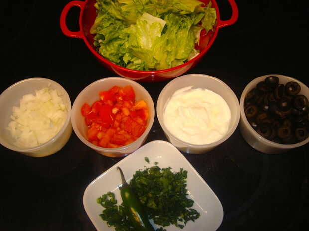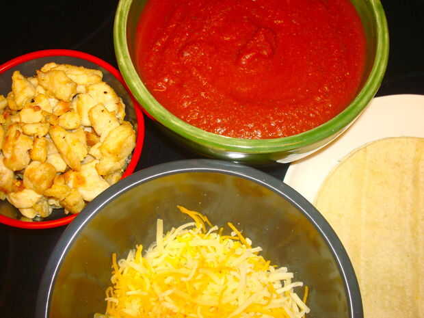 Estación de montaje: Configurar una estación con tres o más de los siguientes ingredientes: salsa de enchilada, pollo, tortillas, cebolla, cilantro, aceitunas, crema agria y queso, para rellenar y decorar las tortillas.