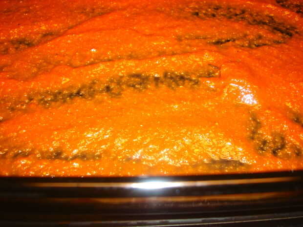 Coloque un poco de salsa en el fondo de un molde para hornear, como se muestra: