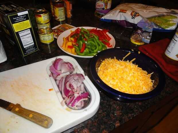 La cebolla debe ser pelada de su piel exterior y cortar en tiras así. (Esto es fácilmente hecho cortando la cebolla por la mitad desde el final de la raíz hasta el final de verdes y colocar las mitades, cortar hacia abajo en la tabla de cortar. Proceder a cortar la cebolla en tiras ¼" por ½ la longitud de la cebolla. Utilice sus dedos para separar las piezas). Colocar en el bol con los pimientos y reservar.