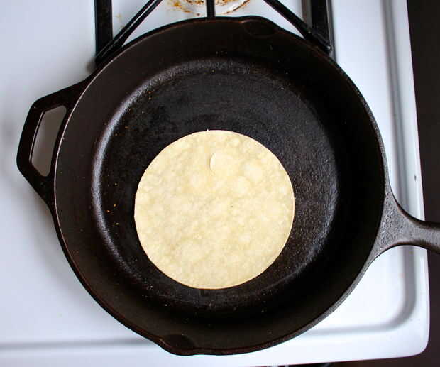 Lanzar una tortilla en y deje que cuelgue hacia fuera por unos segundos el primer lado y luego flip y dejelo calentar hasta flexible. No tarda mucho en todo - tan pronto como se doblan fácilmente ambos sentidos están listos!
