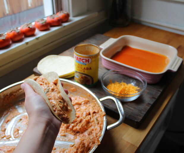 Tomar una tortilla de maíz y manténgalo en su palma. Llene con una o dos cucharadas de relleno y enrollar suavemente. Luego coloque su lado pliegue en la sartén. Continúe hasta que haya llenado la bandeja. (Y segundo si querido!)