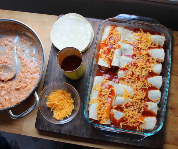 Una vez está llena su bandeja, cubrirlos en la salsa de enchilada y última copa de queso y reventarlas en horno 350 F por 20 minutos.