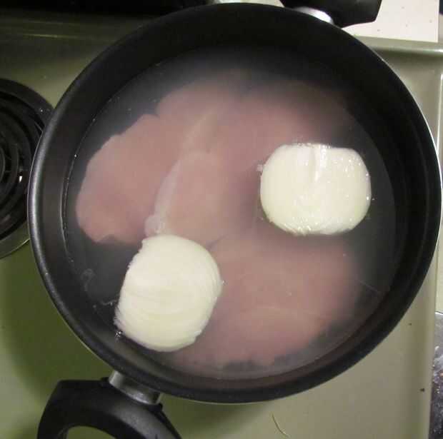 Paso 2: Hervir las pechugas de pollo en una olla de agua con la cebolla entera hasta que estén tiernos.