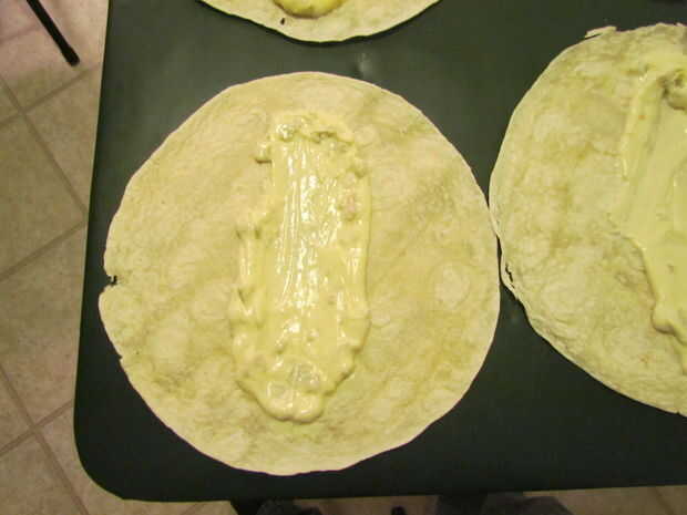 Paso 5: Extienda cáscaras de tortilla en la mesa y añada una cucharada grande de mezcla de sopa por el centro de cada depósito.
