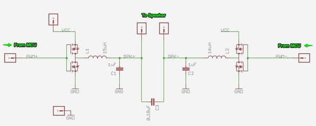 Echad un vistazo a diagrama de circuito siempre. Esto era en realidad uno de los diagramas de circuito usados para el prototipo de este circuito antes de él hizo su manera a la placa Base. La principal ventaja de este circuito es que puede ser utilizado para entregar una señal al altavoz que es 2 x la tensión del riel. O, en otras palabras, podemos conseguir mayor sonido fuera una menor tensión de alimentación. Esta es una técnica común que uso D ICs para generar sonido para tu iPhone altavoces y cine en casa incluso de la clase de la mayoría (si no todos). El propósito del filtro es eliminar todos los ásperos "bordes" del sonido que se crean a partir de las ondas cuadradas de PWM. Por lo general desea que el filtro se "produzca" como cerca de la mejor acústica de sonido que desea escuchar.