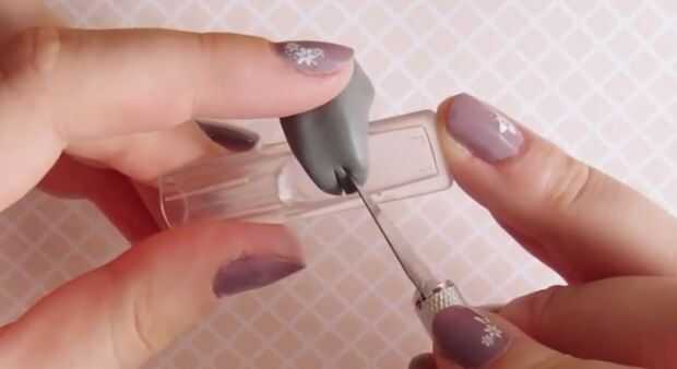 Mientras lo sujeta en el borde recto, corte un poco forma de triángulo en el centro de la parte inferior. Necesita arcilla de sobra más adelante para la cola. Repita este paso con el otro lado de la arcilla, pero esta vez, asegúrese de cortar un triángulo un poco más grande, para permitir suficiente espacio para la cola.