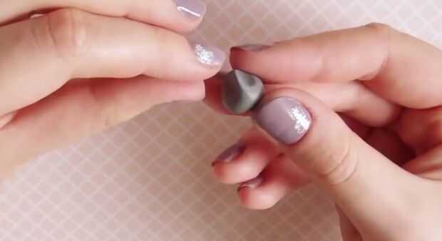 Tomar la bola más pequeña y presiona entre dos dedos. Mover a la derecha, luego presione la arcilla con los dos dedos otra vez. Obtendrá una forma triangular. Presione los bordes también.