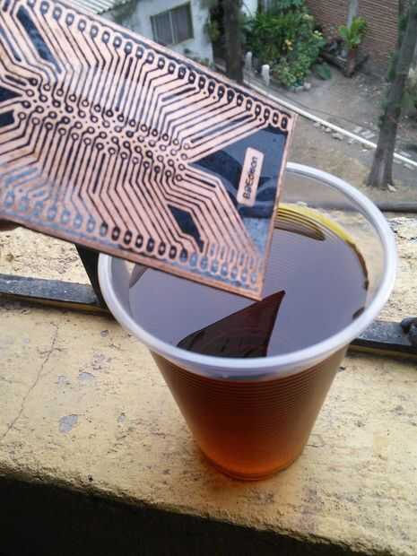 Soltar la placa fenólica en la mezcla, te recomiendo usar un recipiente de cristal, puede acelerar el ataque si usted tiene alguna fuente de calor.