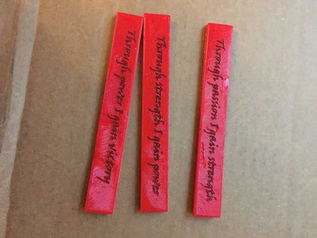 Así que imprimí apartaderos para una base de la pirámide y laser grabado al agua fuerte los refranes en la base.