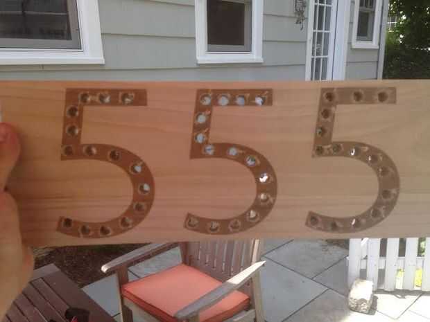 Para poner las luces a través de necesita perforar agujeros a través de los números. Usé un 11/32 '' broca para el mio pero no dude en hacer cualquier tamaño que usted necesita para montar las luces. Entonces usted quiere perforar los agujeros en el tablero. Encontré que para uniformemente espacio les es mejor poner sobre la anchura del pedacito de taladro de una entre cada agujero. Cuando taladre los orificios de tratar de hacer los mismos números tienen el mismo número de agujeros para que se vea profesional.
