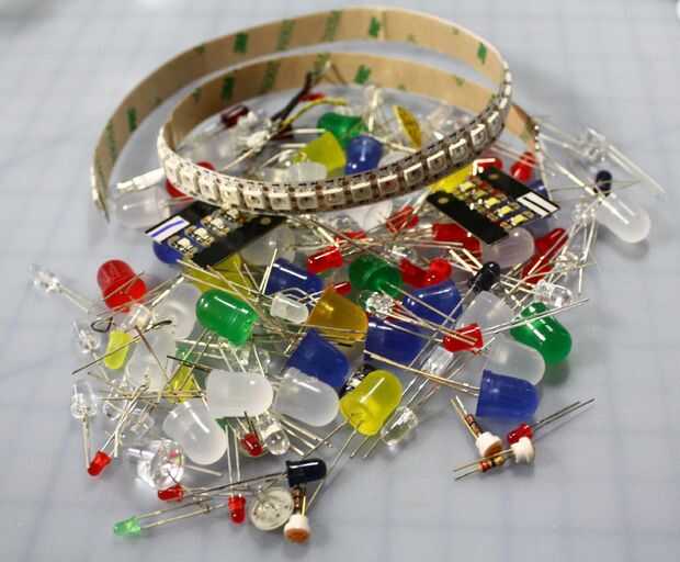 Aquí están algunasotrasfuentes de LEDs que pueden ser útiles. Hay, por supuesto, gran especialmente-hecho LEDs sewable y usted puede adjuntar a una Gemma u otros microcontroladores para más diversión. También... Neopixels. Neeeeeopixels. Para este sencillo proyecto, decidí usar regular de 5mm bastante intermitente los que tuve en mano.