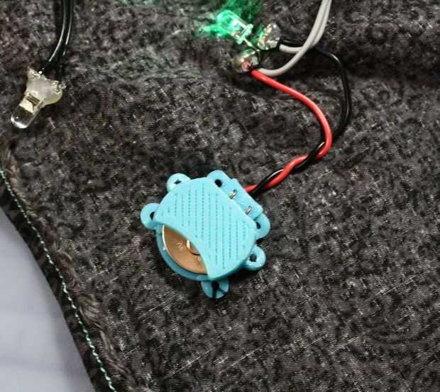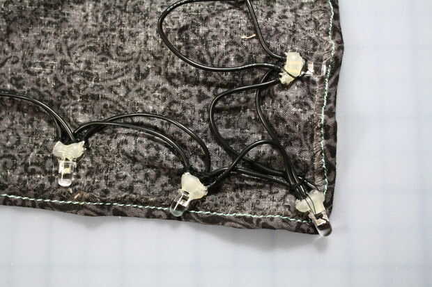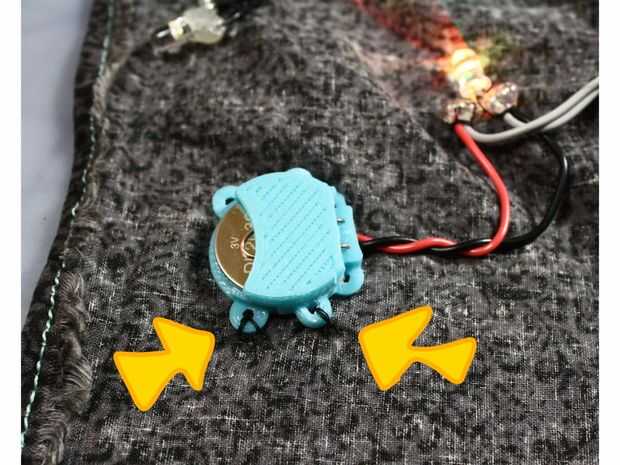 Cuando son los cables todos soldados juntos, puede coserles en la parte posterior de la bandana, con un hilo de color similar. La batería que he incluido tiene agujeros para coser en. Coloqué el soporte de la batería en un lugar donde descansa al lado de mi cabeza. Es lo suficientemente pequeño que no puede sentir o ver y comprimirse ligeramente entre la tela y su cabeza significa que tu conexión sea más segura.