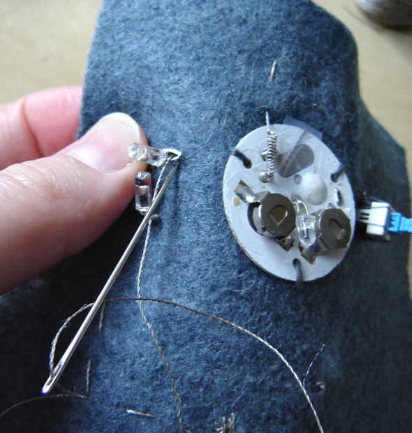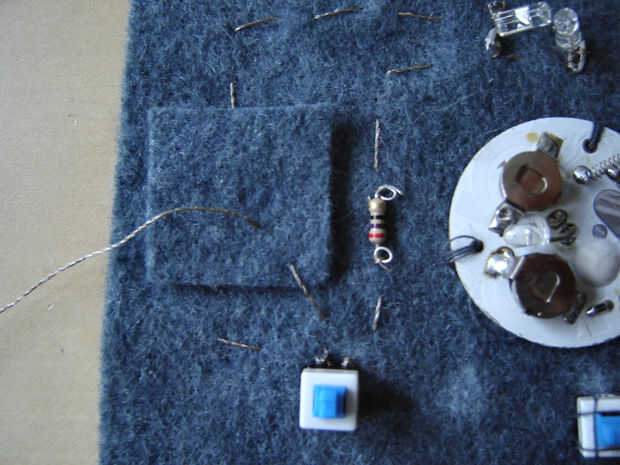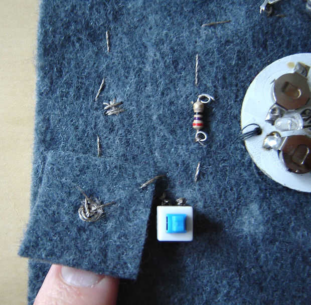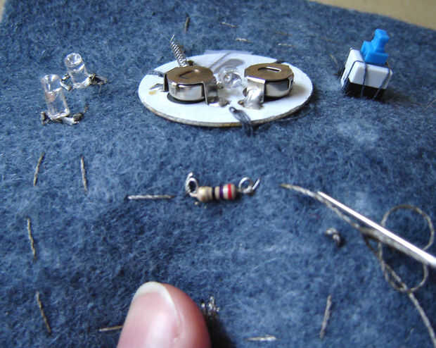 Tomar un nuevo trozo de hilo y atar el extremo para el otro lazo de la resistencia y con una puntada corriente hacia el interruptor y atar el hilo a la otra patilla del interruptor. Desde aquí cosa un camino hacia donde se sentará la batería. Tome el pequeño pedazo de fieltro que corte para el soporte de la batería en el paso 5 y el hilo por el centro del lazo varias veces hacer el nodo positivo.