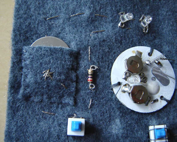 Coser el portapilas para el fieltro a lo largo de tres lados con hilo normal, deslice la batería en el soporte y coser cierre el cuarto lado. Asegúrese de que la batería se ajusta perfectamente y no hay buen contacto entre los nodos del hilo de rosca y los polos de la batería.