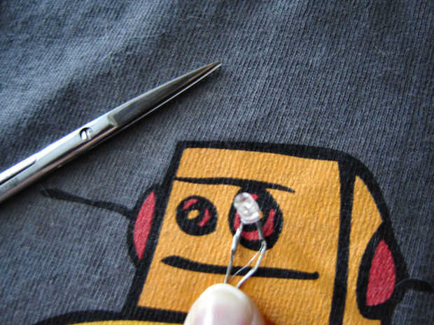 Necesita hacer agujeros en su camiseta para los zócalos del ojo.  Coloque su L:EDs sobre los ojos y cuánto los orificios deben ser de calibre.  Es mejor tener los orificios de ajuste perfectamente alrededor de los LEDs, si son demasiado grandes que los LEDs se deslizan de las órbitas cuando se mueve.