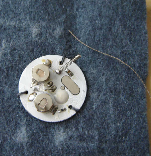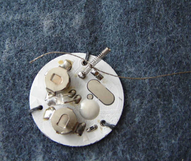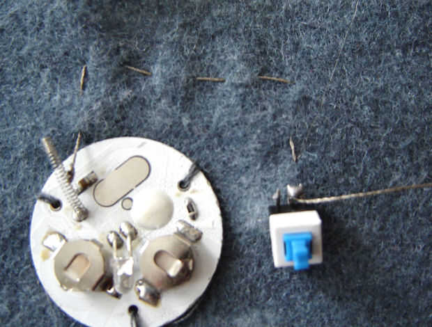 El mecanismo de encendido de este circuito era una sesión de primavera encima de una placa, cuando fue golpeado el circuito primavera golpearía el plateand destello del LED. Sin embargo, quería que se enciende con un interruptor de botón así que tiró el resorte de la placa y había atado de hilo conductor a él.