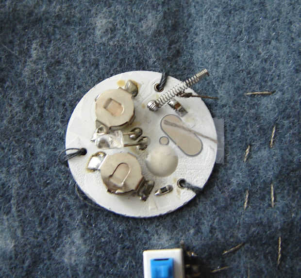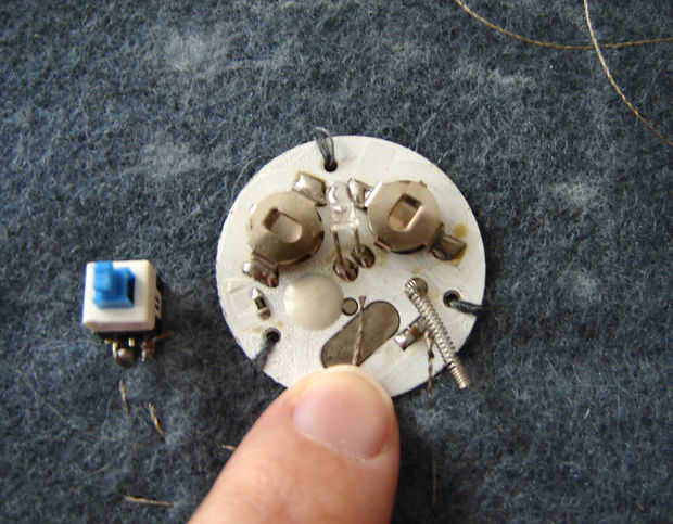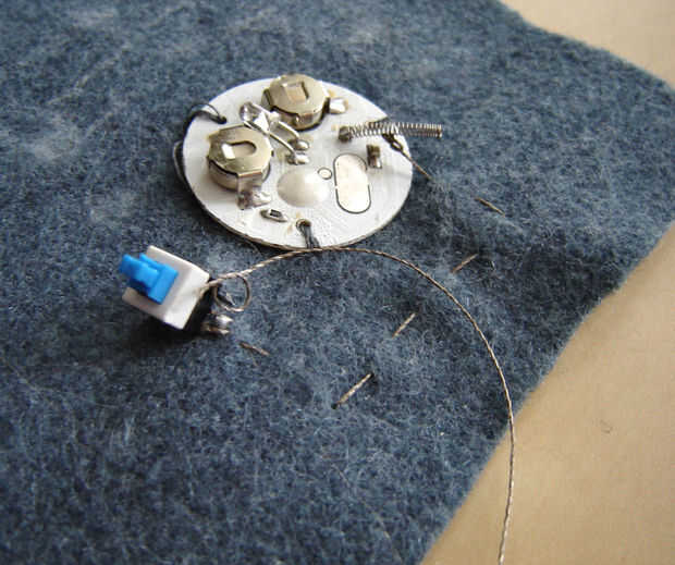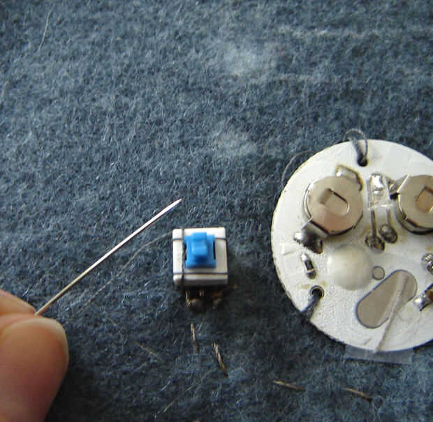 Con una nueva pieza de hilo propicio atar el extremo a la otra patilla del interruptor y coser una puntada corriente a la placa del circuito intermitente. Aquí yo sólo con cinta el extremo del hilo a la placa, asegurándose de que tiene buen contacto con la placa.