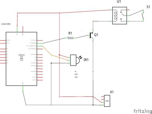 Como no pude encontrar el símbolo de la HX1838 en Fritzing he utilizado un simple LED IR como un marcador de posición. El pinout es el mismo pero utilice la Junta actual con las 2 resistencias para el HX1838 con pines Vcc, GND y en. EN pin va a D11 de Linkit.