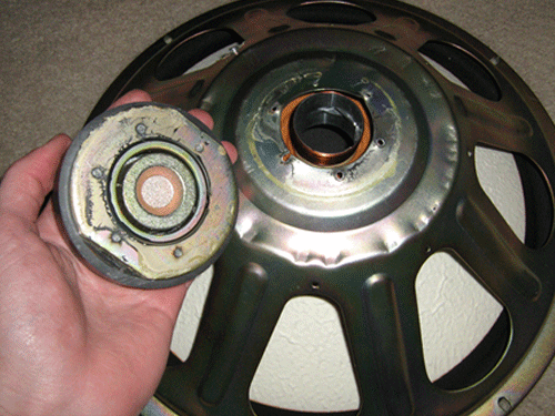 Afortunadamente, estos suelen ser sólo sostenido en algunos pasadores metálicos pequeños y un montón de pegamento (como se puede ver en la segunda foto), por lo que son muy fáciles de bajar. Toma una palanca o un cincel y martíllelo maneras abajo en la costura entre el cono del altavoz y de los imanes, luego sacarlo y repetir esa acción alrededor del círculo completo del imán hasta que finalmente salte (una vez que el cuelgue de ella cada uno sólo le llevará 30 segundos o así, a menos que los altavoces son realmente difíciles).