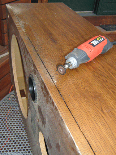 Primero Mida y marque las líneas de los cortes, luego hacer los cortes. Para hacer los cortes difíciles en el lateral de mi caja del altavoz primero tomé una herramienta giratoria y corte una ranura en las líneas donde iba a hacer mis cortes (foto), y luego tomó una sierra de mano y había terminado esos recortes. Probablemente podría utilizar una sierra de calar o sierra circular para lograr este mismo fin, pero no soy muy bueno con esas herramientas, así que la antigua ruta.