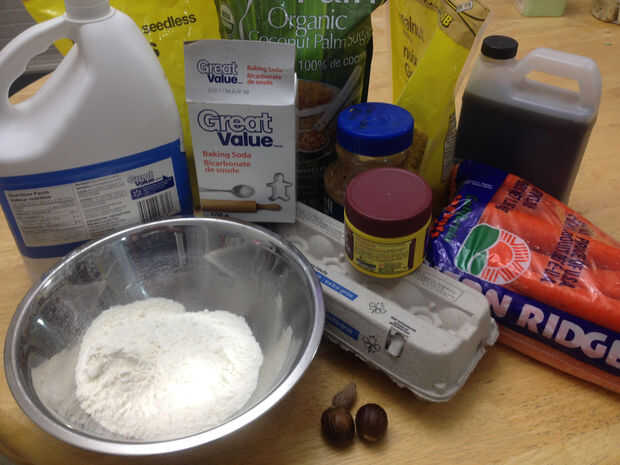 Mezcle harina, bicarbonato, polvo de hornear, sal y la canela. Agregue las zanahorias. Incorpore las nueces.