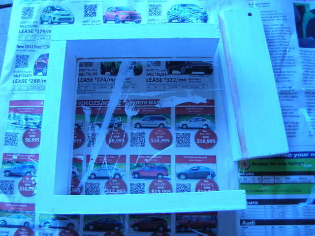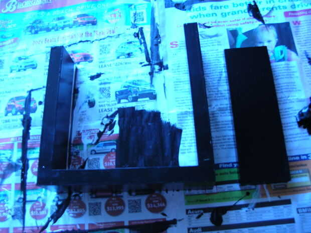 Ahora es el momento para armar el marco. En primer lugar, montar tres lados del marco. Inicialmente tenía la intención de utilizar soportes de pasador para mantener Unidas pero desordenado los agujeros así que fui con clavos. Después parcialmente montando su diapositiva de marco o conjunto el plexiglás en el marco luego colocar la última parte del marco en lugar sólo para asegurarse de que todo encaja. Si no cabe después una rueda de moler en la herramienta Dremel y profundizar los surcos. Si aprieta demasiado apagado y el vidrio se suelta puede sólo la masilla o pegamento caliente en el lugar. Una vez que el marco se ajusta el vidrio iniciar lo cebado, esto sólo es necesario una capa. Una vez seca la imprimación comenzar pintando el lustre negro. Utilicé un pincel de esponja para hacer esto, son baratos y dejan una capa suave de pintura que un cepillo estándar. Dependiendo el espesor de la pintura esto puede necesitar dos capas.
