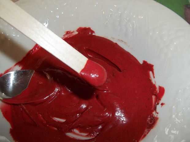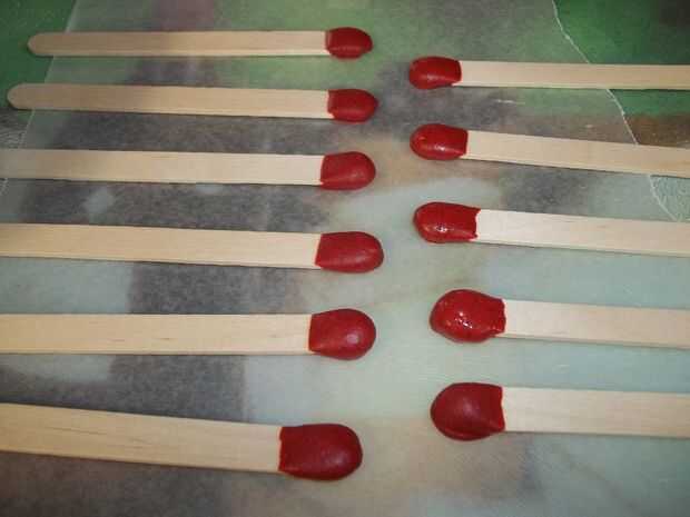 Sumergir cada palito en el chocolate rojo y capa aproximadamente 1/2" del final con el palo, asegurándose de que cubrir ambos lados. Cambialo en el papel encerado se enfríe. Hacer 20 de ellos. Tienen respaldos muy planos con bordes distintos. Debido a esto, y porque estos necesitan una cantidad más considerable de caramelo en ellos, van a conseguir sumergido otra vez.