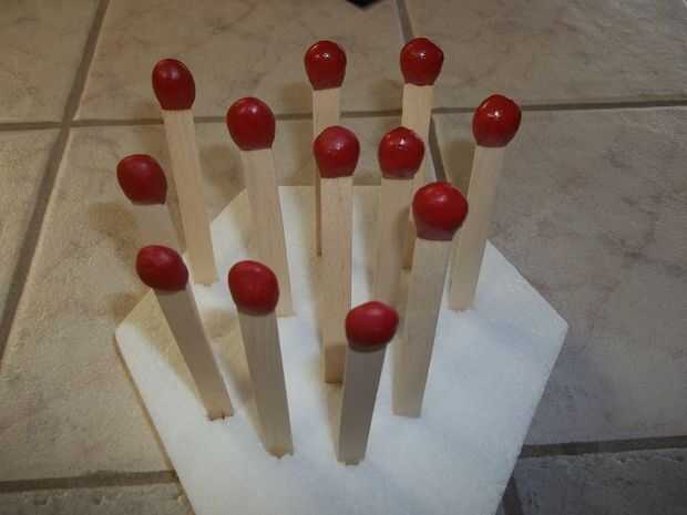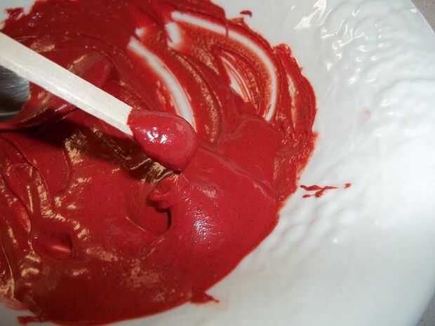Sumergir cada extremo recubierto de caramelo en el chocolate rojo otra vez. Mantener el chocolate en la parte delantera lisa y del remolino de la parte trasera por que tirar de él lejos de la taza. Estos bastones de caramelo serán necesario enfriar en posición vertical para darle un aspecto más realista, redondeado a los dulces. Para ello, colocar en los vidrios pesados o empujando los palillos en un pedazo de espuma de poliestireno.