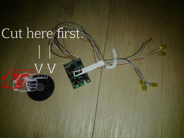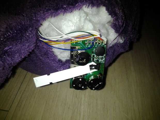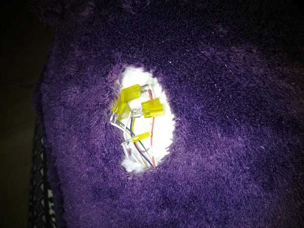 Esto es donde usted escucha feliz cumpleaños para aproximadamente una hora. Encontrar que cables conectan el audio y encuentran el altavoz. Debe haber una batería. Saca la batería, (utiliza tijeras para quitar la batería. Que resultó en un enorme hueco donde estaba la batería. Esto funcionó hacia fuera gran porque dejó la energía sigue funcionando a través de él.) y luego cortar los cables conectar el altavoz a la placa principal del disco duro cosita...: P asegurarse de que se corta lo más cerca posible para que ninguna chispa sale cuando se enciende. Te recomiendo poner cinta aislante por donde cortar, pero no lo hice y estoy seguro de que la almohada de que mi cabeza está en este momento no está en llamas! : 3 poner en las luces es muy fácil. Acaba de poner en su placa madre cosita (alguien por favor me puede decir como se llama?) en el agujero que dejaste abierta. Entonces, pase las luces hacia el otro orificio situado en la frente de Espeon. Coser ambos el cierre de los agujeros. Asegúrese de que el tirón de la blanco es visible, cómo tarjetas de jugar música o enciende para arriba cuando usted las abre. Está adherida con cinta al lado opuesto de la tarjeta y cuando tire hay un agujero que permite que la energía fluya a través de (básicamente como la apertura de un circuito) y luego cuando lo cierre empuja el tirón hacia donde tirar sólido está bloqueando la energía fluya. Coloque un poco de fieltro rojo (en este caso he usado un sombrero de Santa que ya tenía un agujero en él... Lo siento Santa!) sobre las luces. Si las luces no mostrar, probar algo con más agujeros como un sombrero de Santa, una manta roja desgastada. Usted podría intentar cortar los agujeros en el fieltro, pero asegúrese de que los agujeros son estrellas o algo y no simplemente cortes.