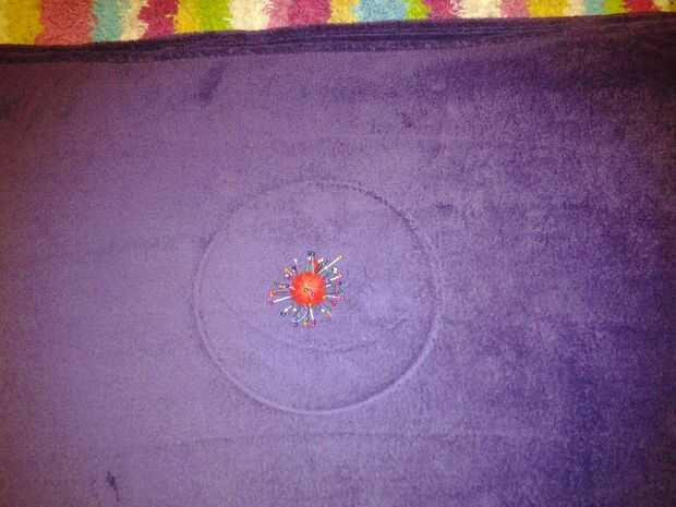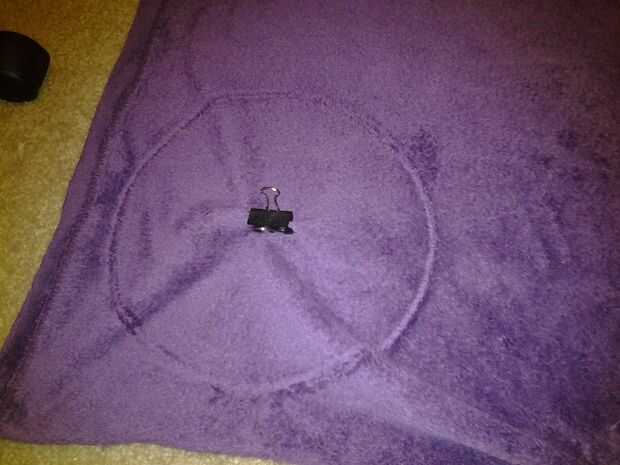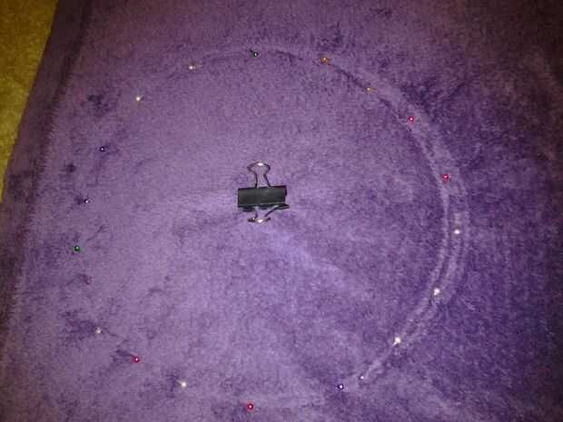 Ahora vamos a hacer la cabeza de Espeon. Para empezar, listo su basura. Coloque el cubo de basura donde usted quiere cortar hacia fuera de su círculo. Luego, presione con fuerza sobre ella y moverse en un círculo. Esto dejará una marca para que puede prender un círculo perfecto. Pongo un clip binder en el centro de Levante a la tela para que pudiera pin el círculo mejor. No puedo decir cuánto sangría después de poner un pin de ayuda. Sólo Coloque el cubo de la basura en la parte superior de las patillas y empuje hacia abajo. Esta parte fue muy fácil.