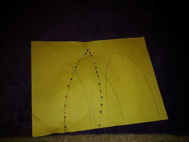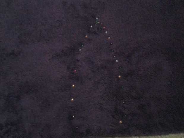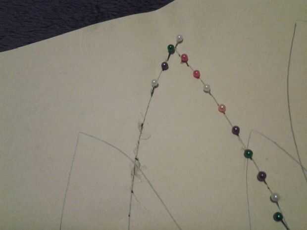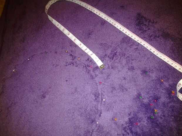 Ahora vamos a empezar en oídos de Espeon y penachos en las orejas. Usando mi foto de referencia, dibujó una oreja en una hoja de papel fino. Luego coloqué la hoja de papel sobre el área que tiene cuatro capas de tela. Colocar allí es muy importante ya que tendrá dos juegos de orejas. Después de poner la hoja de papel en la zona, cubrió. Sólo podría recortar dibujo, pin en la tela y córtelo hacia fuera. Pero bueno! Fue de 3:00! Poco hice la ruta larga... Lo que hice fue. Cubrió por el papel sin cortar hacia fuera. Luego se tira el papel, empuje los pernos a través del papel fino. Esta izquierda solamente los pernos en la tela. Entonces, medir la longitud, anchura y todo ese jazz. Luego pongo marca alfileres en la cabeza donde irían las orejas. Lo hice así que sabía cómo coser las orejas. Que libre los penachos en las orejas.