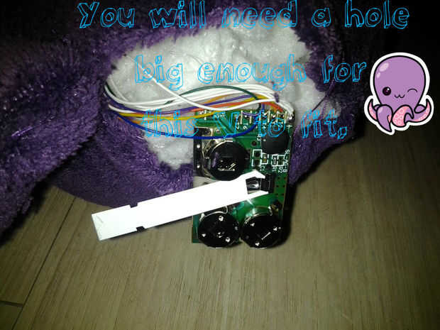 Aquí viene el jefe... DUNNNN Dun Dun. Hacer igual con los oídos. Coser alrededor, dejando un agujero para darle la vuelta adentro hacia fuera y a la materia, dejando los pines marcado donde los oídos deben ser cosidos. Flip y esas cosas de la cabeza, estoy y Ta-Da! Se hace la cabeza! Asegúrese de salir del agujero que utilizó para cosas que usted puede poner el cableado allí. También corte un espacio debajo de la parte superior de la cabeza, es donde se muestran las luces.