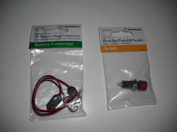 que conozco, sé, Radio Shack es una mierda mal como K-Mart. Sin embargo, se trata realmente de la única tienda de masa de población en los Estados Unidos que provee cables de batería de 9V (artículo # 270-324) y un pulsador de encendido/apagado interruptor (item # 275-011A). Si no tiene unos LEDs por lado, agarrar un paquete pequeño de ellos (colores adecuadamente para proporcionar la luz de la pantalla) mientras estás allí. Soy un gran defensor de apoyar a las tiendas... Si usted puede conseguir artículos similares en una tienda mejor, o puede esperar unos días para obtener de internet, por todos los medios hacerlo.