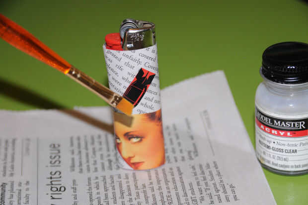 Ahora debe asegurarse de que el fondo de papel frágiles no rip y que las imágenes de primer plano no aparte el papel, destruyendo su encendedor bellamente decorada. Pintar todo el encendedor dos veces con claro semi-gloss asegura que su encendedor será duradera y resistente incluso al agua.