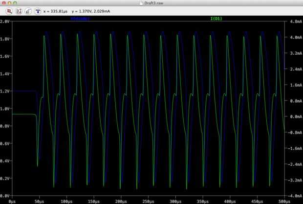 Al principio hago algunas cosas de pruebas y simular el circuito en especia. Mientras que queremos conducir un LED, podemos eliminar el diodo y el condensador. El LED rectifica la señal y no reconocerá una ON/OFF-conmutación del LED. Ahora podemos agregar el multivibrador. Primero trate de usar un circuito astable completo – este circuito no funciona bien - y buscar la mejor frecuencia. He encontrado alternativas en internet que podría ser más compacto y más hermoso. He encontrado mi solución favorita en un sitio web (alemán: http://www.b-kainka.de/bastel36.htm ).