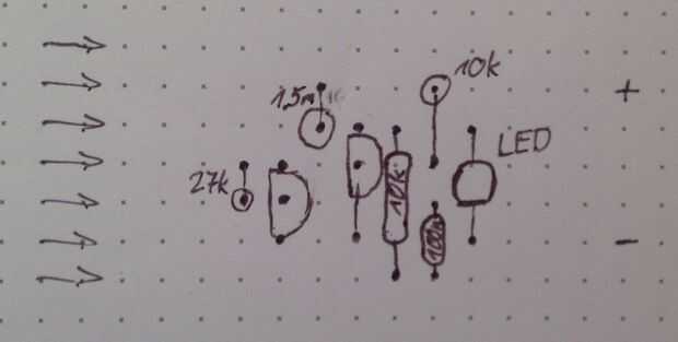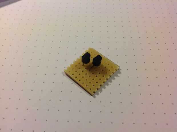 El primer transistor en el tablero como en el diagrama de montaje de la soldadura (o no dude en modificar). Tenga cuidado con la orientación! Las flechas en el diagrama muestran las rayas de cobre.