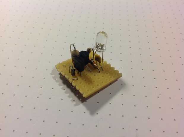 Añadir la falta inductor, capacitor y resistencias. Usar un inductor axial. Hay muchas huellas de inductores – Asegúrese de que encajan su Consejo. Por lo menos usted puede Agregar el LED. La tensión y la corriente del LED es manejado automáticamente por el convertidor. Tenga cuidado con la dirección de la LED o podría ser destruido! Conecte la Junta a una pila AA en el + y – en el diagrama y se hacen.