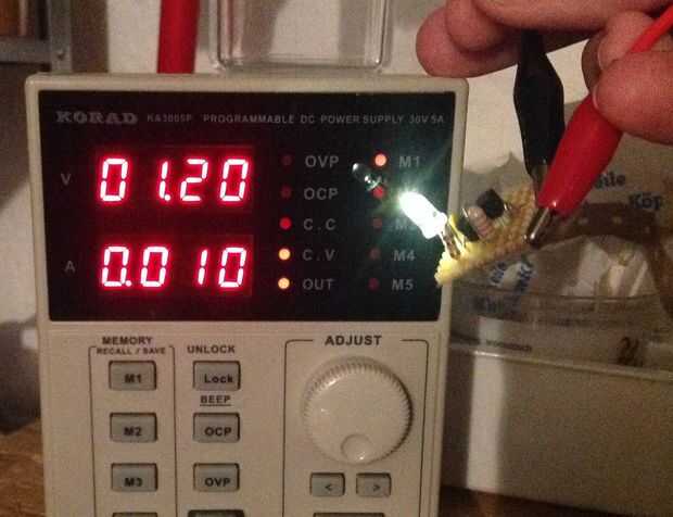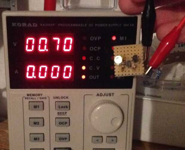 Conecto mi consejo a mi fuente de alimentación ajustable para comprobar el funcionamiento: el LED se vuelve a iluminar a 0.7V. En 1.2V – el voltaje de una batería de NiMh – se enciende brillante. Utilizo un LED blanco de 20.000 mcd. La iluminación no es tan buena como la directamente por camino, pero brilla mucho. Usando un 1100mAh batería a plena carga, el LED brilla en mis pruebas durante 4 días y más! Pueden utilizarse incluso pilas – antes de que se mueven a la papelera.