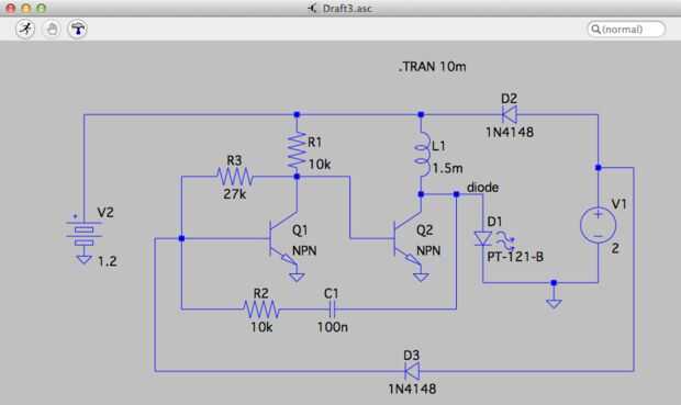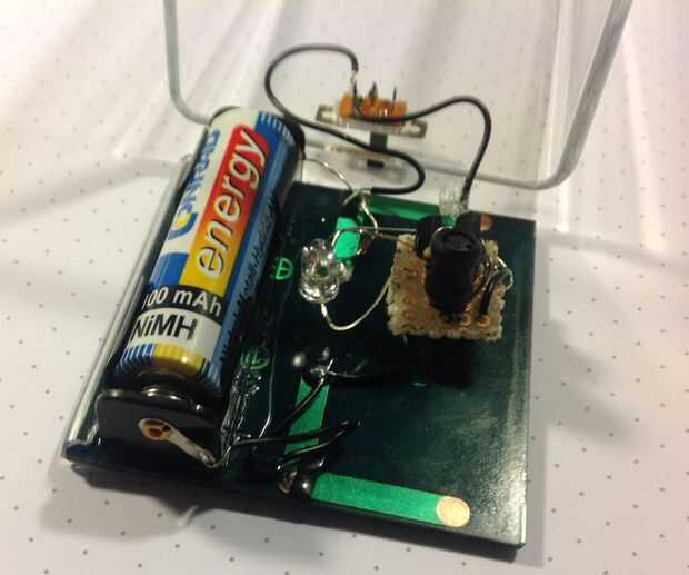 Utilice su nueva Junta Directiva directamente en una lámpara solar. Necesita una célula solar de 2V, dos estándar diodos (1N4148) y un clip de la batería. Un diodo conecta de células solares y la batería. Los otros diodos es usado agregar la placa un puerto enable-sí es cierto! -Conectando la celda solar y la base del transistor izquierdo el LED inicia a la luz, cuando no hay luz. Las conductas de transistor izquierdo y una poco salida flujo canal la 10k resistencia de valor corriente y el LED. Se trata de 0.2mA – nada que preocuparse. El circuito genera en este modo no hay señal rectangular y el LED pone no hay suficiente energía para iluminar. Puede utilizar diodo shottky para establecer principio del rayo a una iluminación más baja.