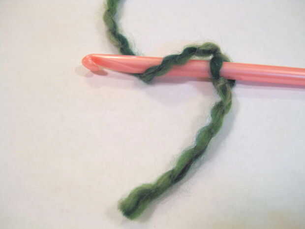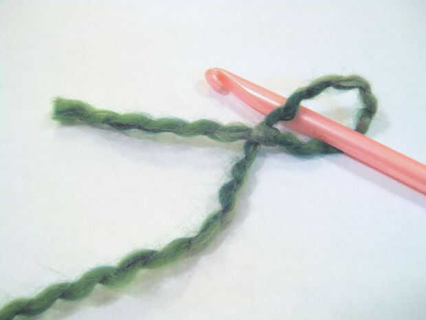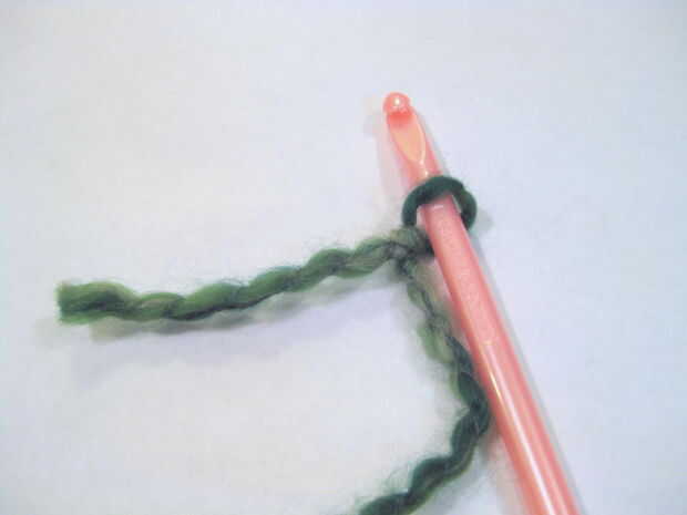 Después de haber hecho cuatro cadenas en su anzuelo, hacer seis puntadas del resbalón en la segunda cadena de la última (colgando en el extremo). Esto formará un pequeño anillo.