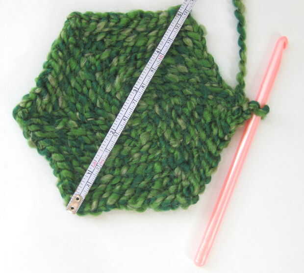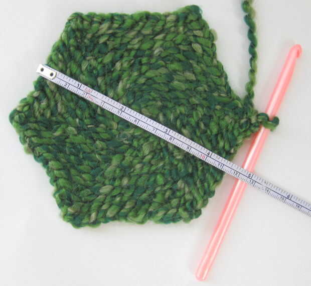 - Continuar este patrón hasta que el diámetro del hexágono es de unos 12 cm (4.5 a 5 pulgadas) de diámetro. (Medir los diámetros mayor y menor y les media). Para mí, esto fue justo después de la Ronda 9 (con total de 66 puntos de sutura).