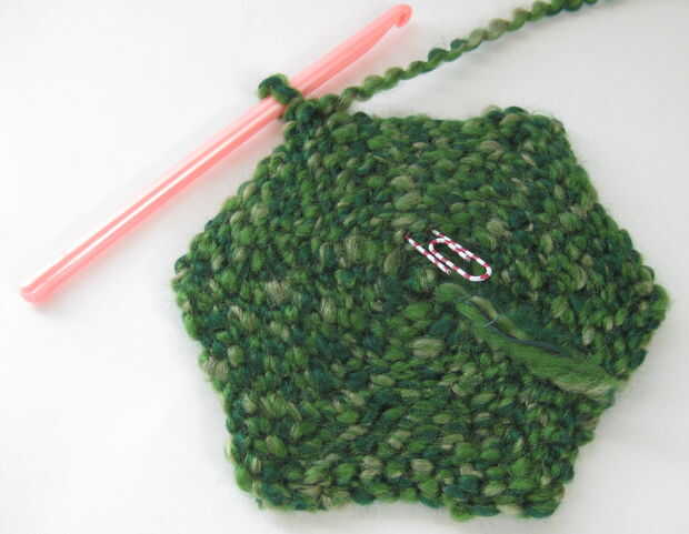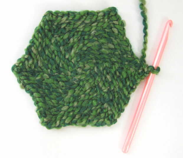 Consejos mientras las ramas: encontrará que la puntada donde pones la hoja 2 puntadas en formas un bulge/bulto en el tiempo. (Esta es una de las esquinas del hexágono que se forma). Si te cansas de contar los puntos en cada ronda, podría intentar solo busca hacer que el "2 sl st" entra en un punto cerca de la punta de la protuberancia.