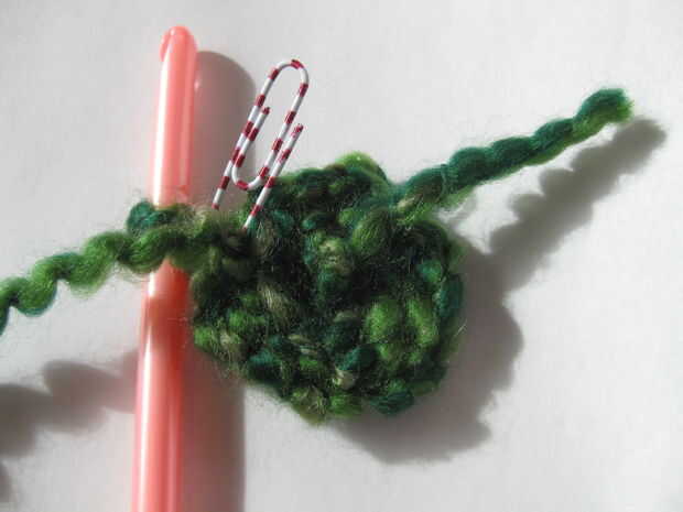 - Ronda 1: Deslice la puntada (sl st) 1, 2 sl st en la siguiente puntada. Repetir este proceso seis veces por lo que han hecho una ronda completa. (Cuando termines con esta ronda, usted debe tener 18 total 18 puntos.)