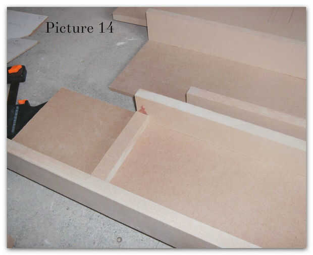 Para ayudar a apoyar los laterales usé algunos que recortes entre el frente del pilar, poner la última de ellas en la parte superior de la cara interna, esto ayudaría a apoyar la placa frontal una vez. La placa era una sola pieza de MDF de 18 mm, esto es importante porque constituye el principal apoyo del manto dándole toda su fuerza. También se utilizó para establecer el ancho del manto como cabe en toda la columna. (Imagen 12)