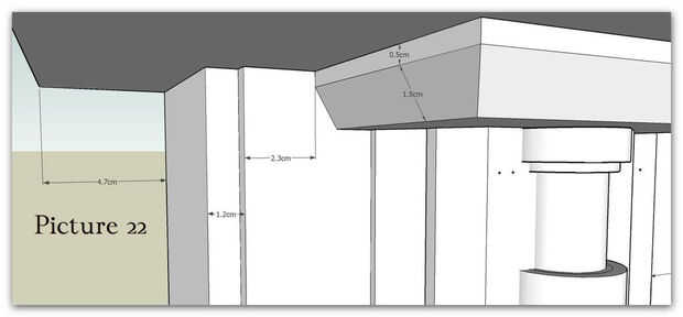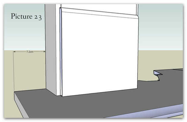 Esta fue la parte fácil, usando una combinación de pegamento y tornillos sujeta primero la base para el piso y luego los pilares y placa de cara a la pared con bloques de parada dentro de la base de cada pilar para asegurar la correcta colocación. Usé los lazos de pared original para asegurar la parte superior de los pilares.