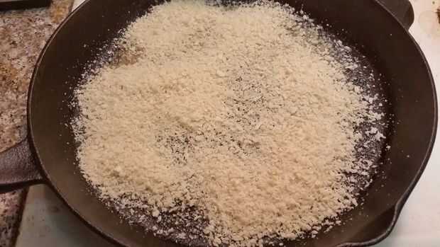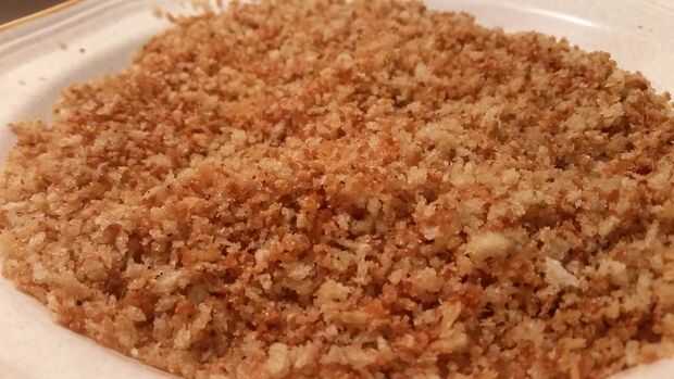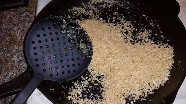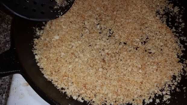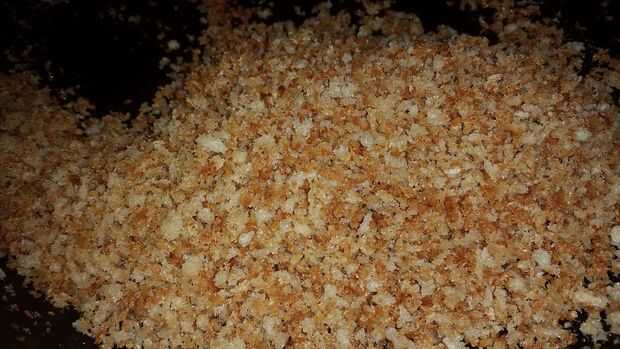 Esto es obviamente demasiado muchas fotos de migas de pan Panko pero bueno algunas personas amor pan rallado. Tirar la grasa de tocino en la sartén tal vez no todos pero la mayor parte de él, lleve a fuego medio alto y echar el pan rallado Panko, si haces demasiados puede utilizar el resto para otro proyecto como toppings del helado. Constantemente agregue pan rallado porque ellos se dorarán muy rápido en la grasa de tocino. Una vez que son un buen color marrón claro luego apártelos en una placa amplia baja y deja enfriar. Pluma de.