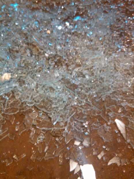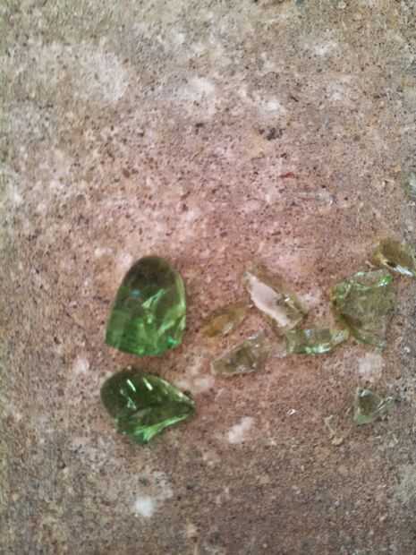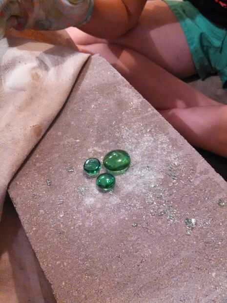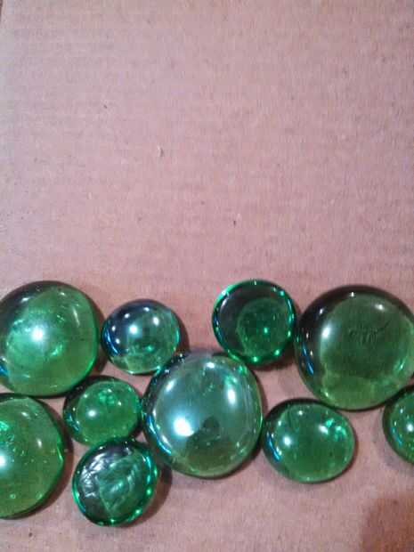 Compré algunos vidrio decorativo verde de la tienda de dólar. Ya que estaban en guijarros y no quería que la forma redonda, así que decidí romperlas. Para ello coloqué en un bloque de hormigón y les cubrió con lona antes de romper con un martillo. Esto impide que los fragmentos vuelan todo. Independientemente de la lona, asegúrese de usar gafas de seguridad!