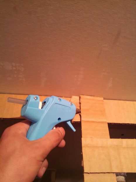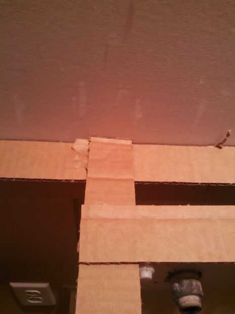 Después de que usted ha reunido todos los materiales y herramientas el primer paso es hacer una plantilla. Primero tomó la cartulina y córtala en tiras. Esto se hace a menudo con el laminado de la puerta pero tenía cartón por parte de la vanidad nuevo. Para hacer la plantilla que usted coloque las tiras a lo largo de la pared y medir la proyección adecuada de la vanidad. Utilice la pistola de pegamento caliente para conectar las piezas entre sí. Si la pared está muy torcida tienes pegue pedazos pequeños a lo largo de una pieza recta más grande para acomodar la curva. Asegúrese de que toda tu cartón o chapa quede en las esquinas para darle una buena esquina.
